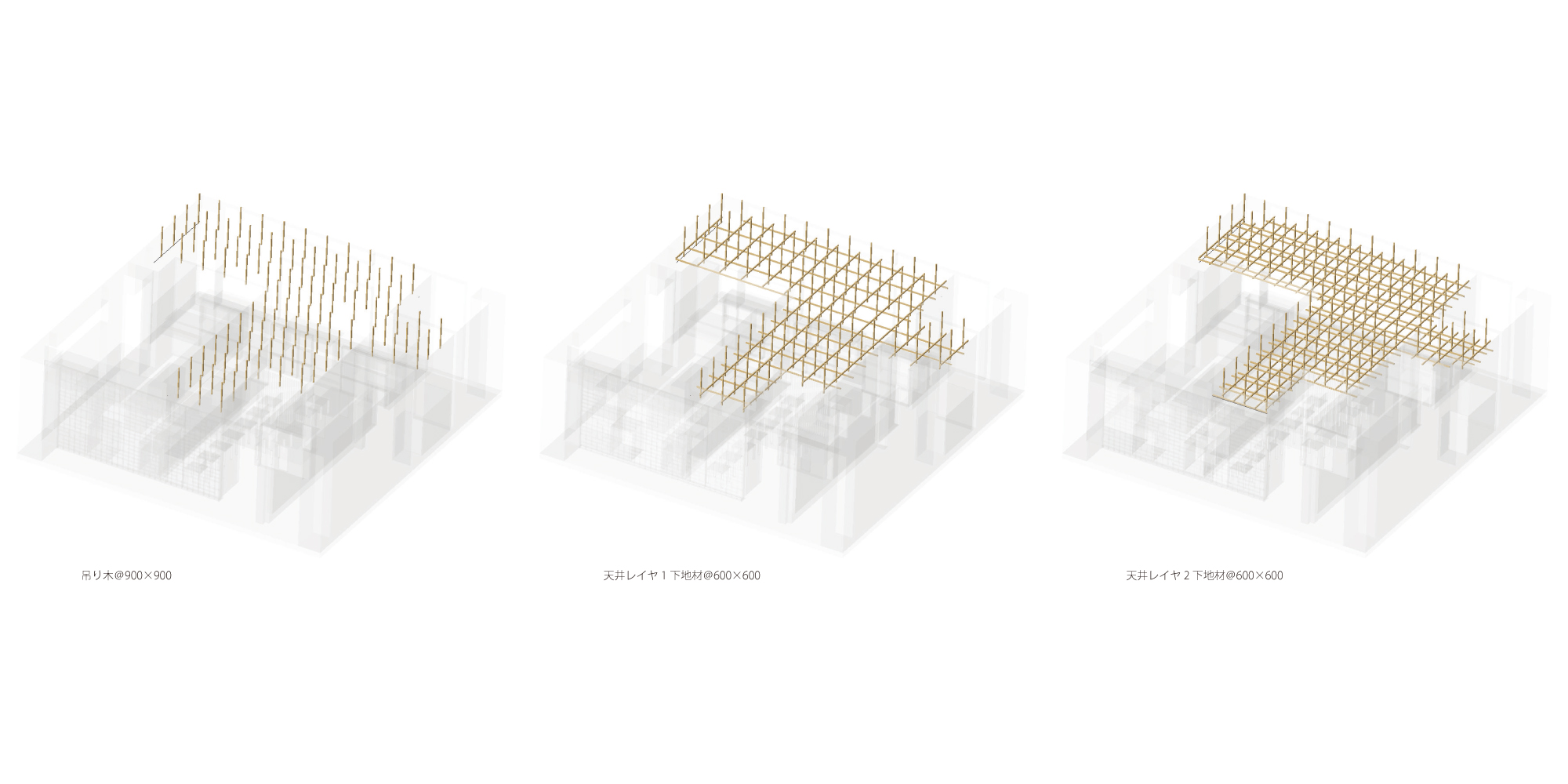 下地材は安価な分曲がりや節が多いため、最低限死に節の無い物を選定し、多少の曲りを許容する代わりにそれを感じさせない立体的な格子組としている。