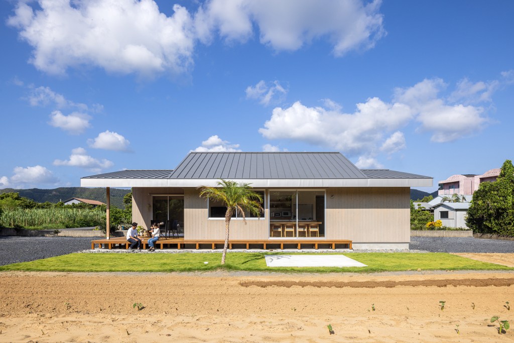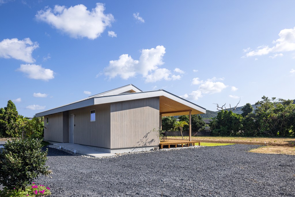 この段差のある変形切妻屋根の形状は入母屋とも切妻とも似ているようで違う。集落にある軒の低いトタン屋根の入母屋のような懐かしい形態をどこかで想起させるような、風土に馴染む新たな屋根形状を目指した。
