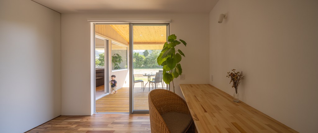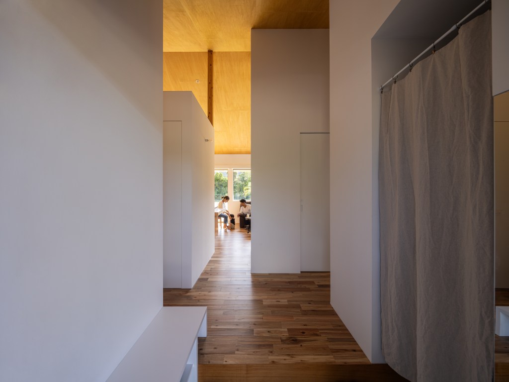 住宅としては大きなリビングと小さな個室、という形式が一般的であるがそれでは母と子世帯の分断を解決することはできない。そこでリビングと同じくらいのボリュームの大きな軒下空間が、リビングにも玄関にもなり母の部屋とリビングを繋ぐ平面構成を考案した。裏動線の廊下は行き止まりなくそれぞれの部屋と接続するが、母の部屋とリビングも、縁側を介して緩やかにつながっており、それぞれの部屋の開口計画によって互いの気配を感じるオープンな場所と身を隠せるクローズな場所を生み出している。