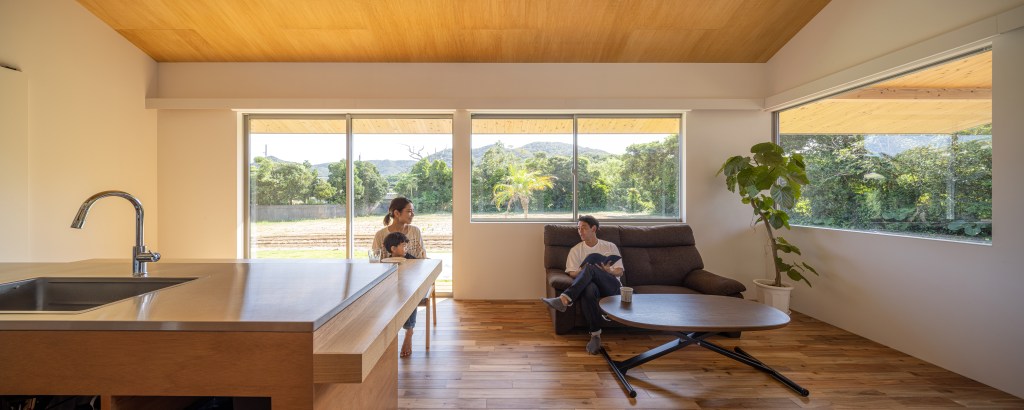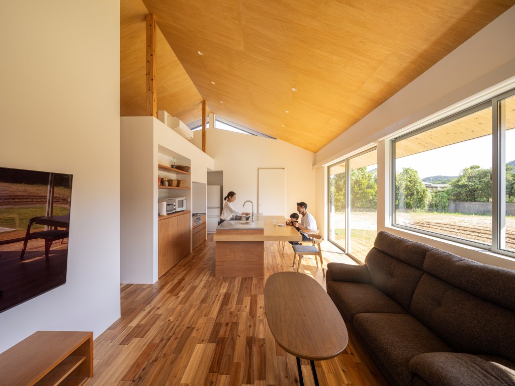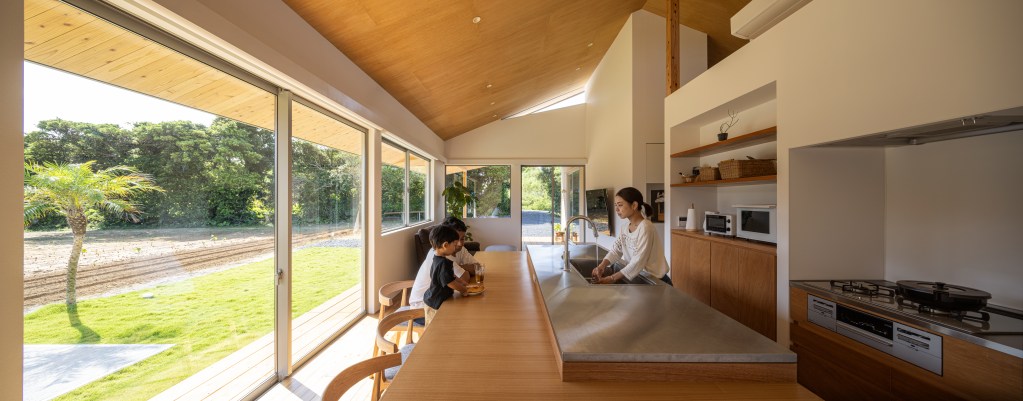この平面を覆うような大きな切妻屋根をかけ、一つの住宅としてのまとまりを生み出した。切妻屋根は勾配の異なる3ブロックに分け、段差部分に設けたガラスから屋内のリビングに自然光を採りこむ形としている。明るい空間には自然と人が集まる。このリビングは、母も気兼ねなく一緒の時間を過ごすことができるような空間を目指した。