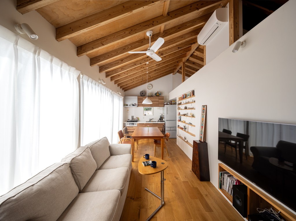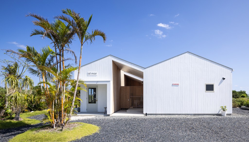 切妻の家形が2つ並んだようなボリューム構成は、店舗に訪れる人が一目で店舗と住宅を分離して認識することができるようにする意図に加え、建築の最高高さを低く抑えることで台風の力を受けにくくなるという構造的メリットも享受している。