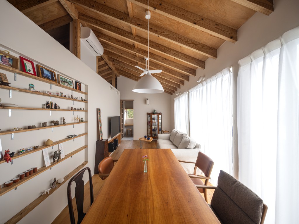 仕上げに「素人感」を持たせたいというクライアントの希望から、塗装や家具工事の多くが施主本人の手に委ねられた。内外壁の塗装、店舗内の家具造作、住宅内の棚工事についてはほぼ全て施主自身が仕上げていることで工事コストを抑えることにも繋がっている。その結果として引き渡しからオープンまでかなりの時間を要したが、その間に施主自身が施工に向き合うことでより愛着が増したのであろうか、開店直後から店主に似合った雰囲気を醸し出していたように感じる。