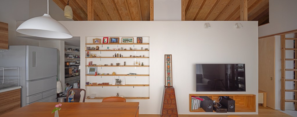 ここでは『オモテ土間』と名付けた屋根付きの半屋外空間を店舗と住宅の間に挟みこむことで、パブリックとプライベートの切り替えをスムーズにする緩衝領域としての機能を持たせた。それと同時に、もう一つのリビングのような場となることを期待している。住宅内でも夫婦それぞれのプライバシーを重要視するライフスタイルのため、リビングとオモテ土間で個々人の時間を過ごせることがこの小さな家では重要な価値となる。